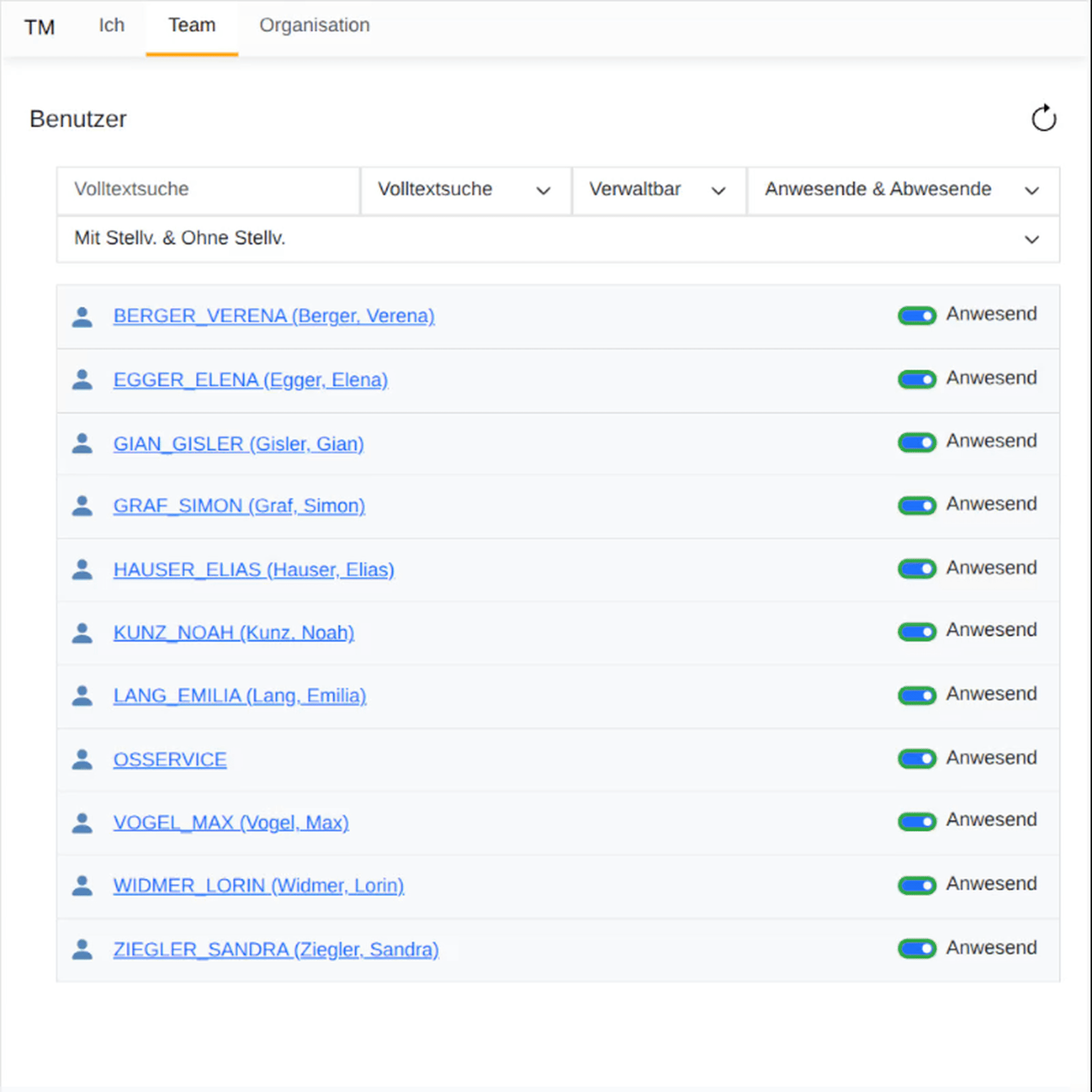 Im Reiter Team sehen Mitarbeiterinnen und Mitarbeiter, wer vom Team an- und abwesend ist. Legen Sie individuell fest, welche Informationen Teammitglieder im TeamManager sehen und bearbeiten können.